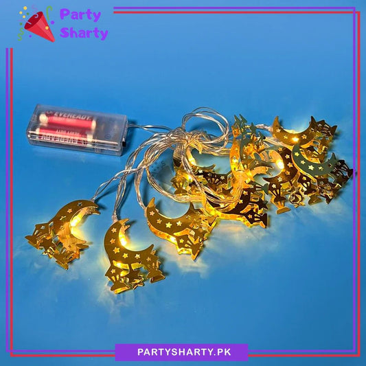 Warm Color Crescent Moon With Hanging Star & Lantern Style Shaped Led Metal Fairy String Lights for Ramadan & Eid Decoration